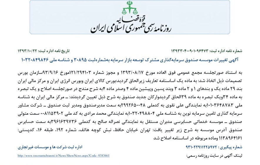صندوق توسعه بازار سرمایه در تاریخ 91.11.17 با سرمایه اولیه 30 میلیارد تومان با دریافت مجوز از سازمان بورس و اوراق بهادار (سبا) به عنوان صندوق سرمایه گذاری موضوع بند ٢٠ ماده ١ قانون بازار اوراق بهادار مصوب آذر ماه سال ١٣٨٤، فعالیت خود را آغاز کرد. این صندوق با شماره 11130 نزد سبا به ثبت رسیده است. عملکرد این صندوق بر اساس مفاد اساسنامه و امیدنامه و در چارچوب قوانین و مقررات مربوطه است. فعالیت این صندوق تحت نظارت سبا انجام شده و متولی صندوق نیز به طور مستمر فعالیت آن را زیر نظر دارد. مدیریت دارایی های صندوق که عمدتاً شامل سهام شرکت های پذیرفته شده در بورس می شود، توسط مدیر سرمایه گذاری صندوق صورت می گیرد. سرمایه گذاران در ازای سرمایه گذاری در این صندوق گواهی سرمایه گذاری دریافت می کنند. صدور واحد سرمایه گذاری و ابطال آن ها بر اساس ارزش خالص دارایی های روز بعد از ارائه درخواست صورت می گیرد. علاقمندان برای دریافت اطلاعات بیشتر در مورد الزامات فعالیت صندوق می توانند اساسنامه و امیدنامه صندوق را مطالعه کنند.
