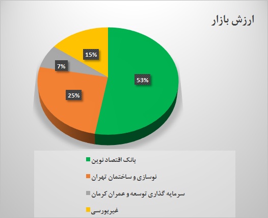 همانگونه که مشاهده می شود 53% ازکل ارزش سبد دارایی ها به بانک اقتصاد نوین اختصاص یافته است. شرکت های غیر بورسی با روش بهای تمام شده محاسبه شده اند.