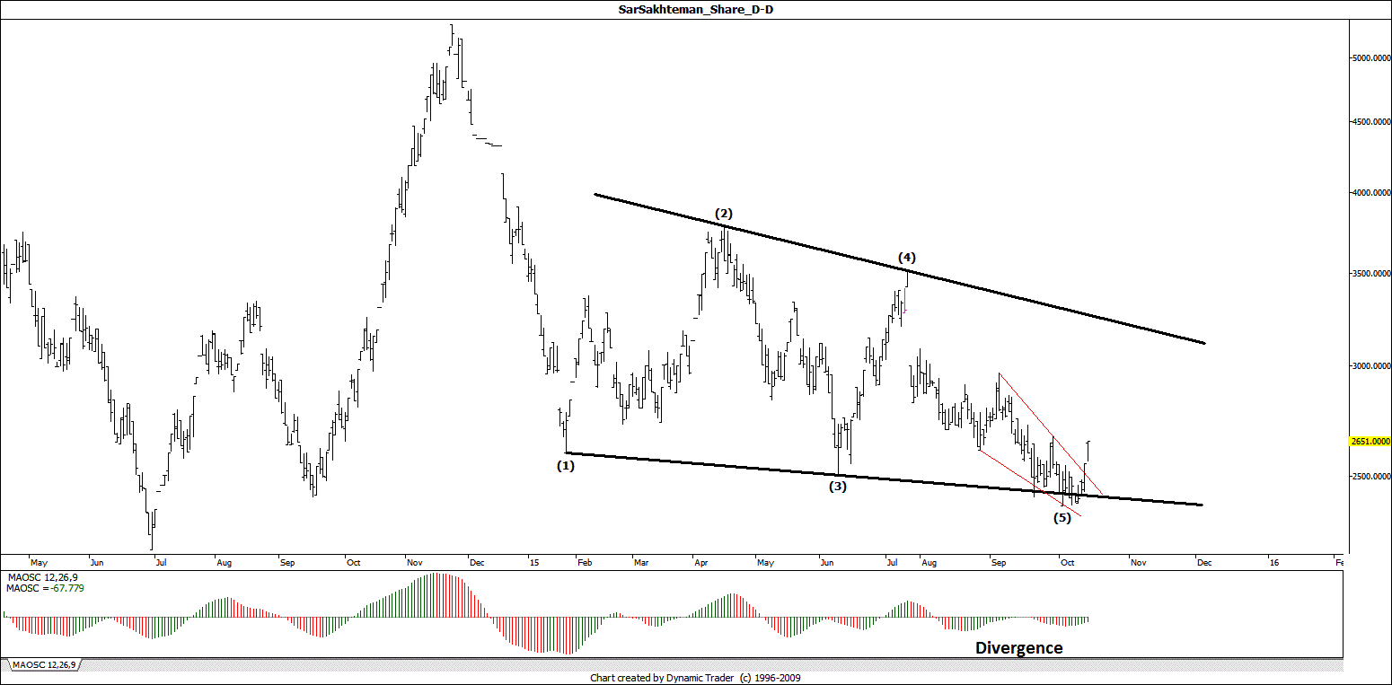 در صورتی که قیمت بتواند خود را بالای 320 - 325 تومان تثبیت کند عملا صحت الگوی پیش بینی شده تایید می شود و می توان در میان مدت انتظار رشد سهم تا حوالی خط واصل 1 به 4 یعنی محدوده 450 تومان را داشت.