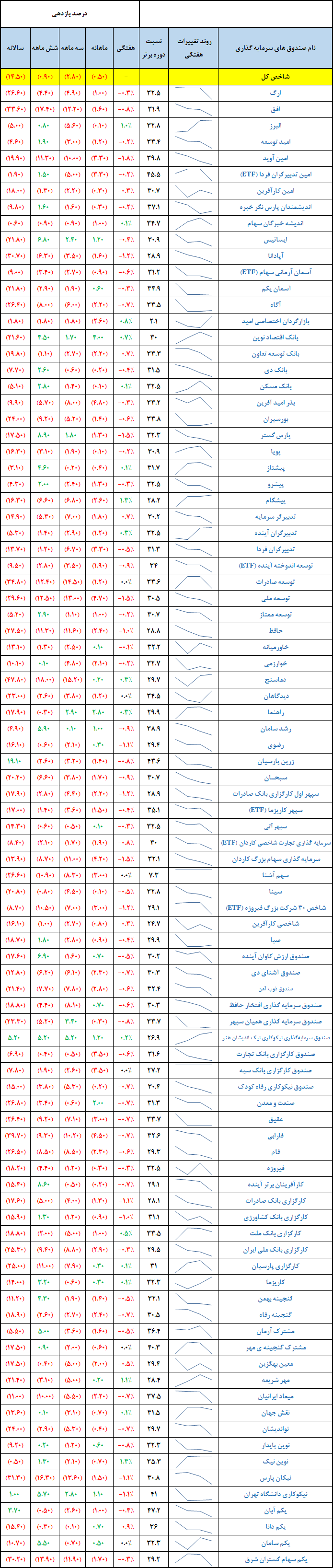 اطلاعات دقیق و تحلیلی از 91 صندوق سهام را در جداول زیر مشاهده می نمایید. لازم به ذکر است این جداول بر اساس اطلاعات روزانه صندوق ها طی یک هفته گذشته به روز رسانی شده است : (جداول پیوست بر حسب حروف الفبا مرتب شده اند)