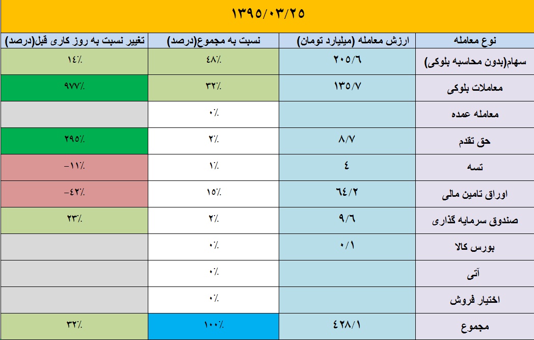 ارزش معاملات عادی سهام و حق تقدم در بازارهای مختلف بورس و فرابورس امروز به بیش از 214 میلیارد و 300 میلیون تومان رسید که نسبت به روز دوشنبه 18 درصد رشد را نشان می دهد . روز سه شنبه 427 نماد سهام و حق تقدم بین معامله گران داد و ستد شد که در یک ماه اخیر بی سابقه است . به این ترتیب درک این موضوع که میانگین ارزش معاملات نمادها در بورس افت قابل توجهی نسبت به ماه های قبل دارد چندان مشکل نخواهد بود .