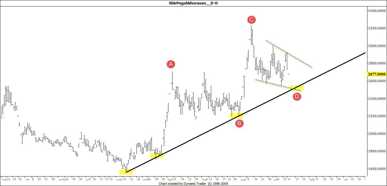 نوسانات چند ماهه اخیر سهم تحت تاثیر یک ترند صعودی قرار دارد. طی این مدت و در نمودار تعدیل شده ، ارزش هر سهم از حوالی 150 تومان تا قیمت های بالاتر از 300 تومان رشد داشته است. در روزهای اخیر قیمت گارد اصلاحی به خود گرفته است. به گونه ای که تقریبا 20 درصد از ارزش هر سهم کاسته شده است. این افت قیمتی در داخل یک محدوده تراکمی در جریان است که کف این الگو همپوشانی خوبی با خط روند نزولی مورد اشاره دارد.
