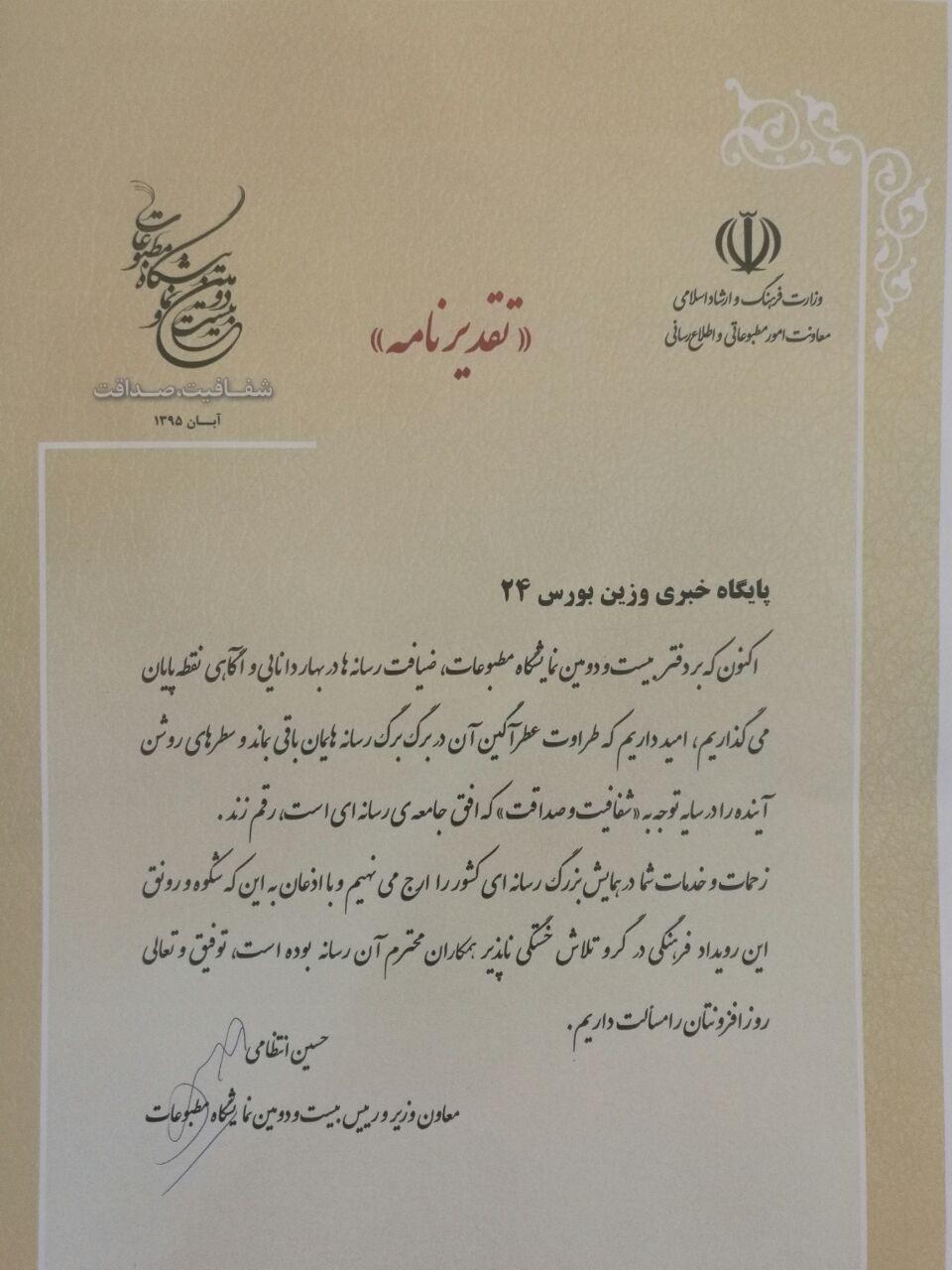 اما پایگاه اطلاع رسانی و تحلیلی بورس24 به همراه ماهنامه بورس امروز در بیست و دومین نمایشگاه مطبوعات و رسانه حضور پررنگی داشت و در این 7 روز میزبان فعالی برای بازار سرمایه ای ها و مسئولان اقتصادی بود. در پایان نمایشگاه نیز پایگاه خبری بورس24 از حسین انتظامی معاون مطبوعاتی وزیر ارشاد و رئیس بیست و دومین نمایشگاه مطبوعات لوح تقدیر دریافت کرد.