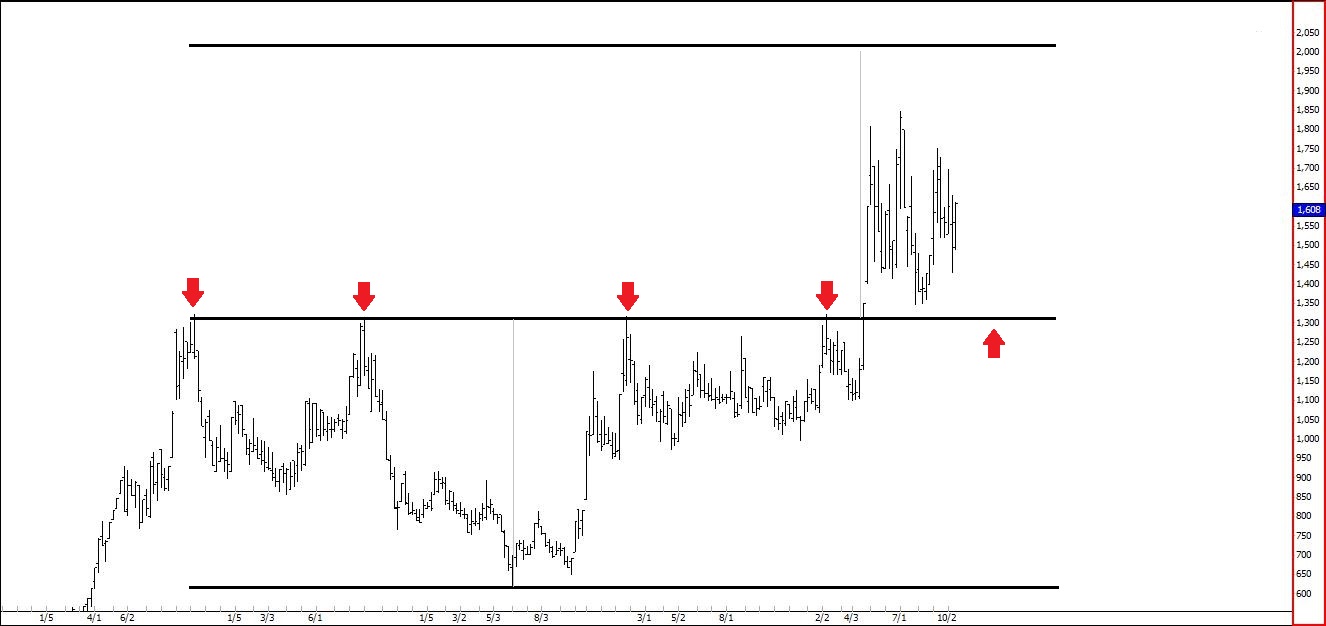 در چارچوب زمانی هفتگی ، از اواخر سال ٩٢ قیمت بارها در شکست باند مقاومتی ١٣٠ - ١٣۵ تومان ناکام بوده است. به گونه ای که هر بار قیمت به ناحیه مورد نظر می رسید شاهد افزایش عرضه ها و متقابلا کاهش حجم خریداران بود که در نتیجه باعث اصلاح و عقب نشینی قیمت می شد! بالاخره در روزهای پایانی تیر ماه قیمت با یک کندل پرقدرت...