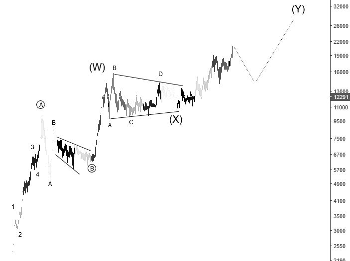 "از منظر تئوری امواج الیوت نوسانات قیمتی سهم از بدو عرضه را می توان در قالب امواج کارکشن شمارش کرد. ابتدا قیمت در قالب یک 5 موجی رشد داشته که آن را با لیبل A از یک الگوی اصلاحی زیگزاگ نامگذاری کردیم. موج B از این الگوی زیگزاگ در قالب یک الگوی اصلاحی پهنه ظاهر شده و در ادامه موج C از این الگو تا حوالی 1530 تومان پیشروی کرده. کل این حرکت را با لیبل W نامگذاری کردیم. در ادامه موج X به صورت مثلث ظاهر شده. در حال حاضر موج X به شکل یک الگوی مثلث متقارن ظاهر شده و بنظر می رسد اکنون در لگ e از این مثلث قرار داریم. در صورت عبور قیمت از باند مقاومتی 1470 - 1500 تومان انتظار داریم در قالب موج Y قیمت ابتدا تا محدوده 2000 تومان و در ادامه تا حوالی 2800 تومان پیشروی داشته باشد. حد ضرر این تحلیل روی 1200 تومان قرار دارد."