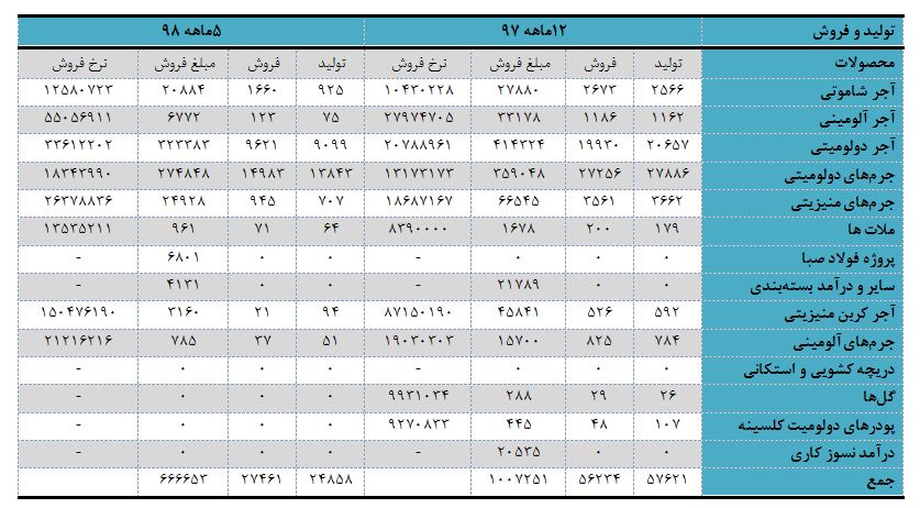همانطور که میتوان دید شرکت علاوه بر تولید و فروش به صورت حقالعملکاری نیز فعالیت دارد و طی سال 97 در حدود 4 درصد از درآمد خود را از محل نسوز کاری و همچنین درآمد بستهبندی کسب نموده که طی 5 ماهه نخست سال جاری به 1.6 درصد کاهش یافته است. همچنین میانگین ماهانه میزان تولید شرکت طی سال جاری در مقایسه با سال قبل در حدود 4 درصد افزایش یافته ولی با توجه به فروش بیشتر از تولید در برخی محصولات همچون آجر شاموتی و آجر دولومیتی، میزان فروش ماهانه رشد 17 درصدی را نشان میدهد. همچنین با افزایش میانگین نرخ فروش محصولات در حدود 39 درصد طی سال جاری در مقایسه با میانگین سال 97، درآمد فروش ماهانه در مقایسه با سال قبل 59 درصد افزایش یافته است.