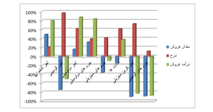 طی سال جاری همچنین میزان تولید و فروش شرکت در محصولات مختلف ناشی از میزان سودآوری و همچنین نیاز بازار تغییر نموده که با تغییر در نرخ فروش، باعث تغییر در ترکیب درآمدی شرکت شده. چگونگی تغییرات به صورت جدول زیر خلاصه شده است: