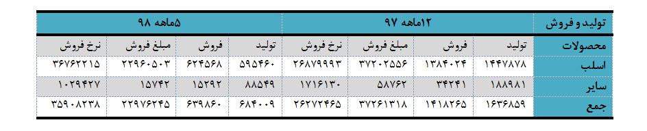 بر اساس اطلاعات گزارش فعالیت ماهانه، میانگین تولید ماهانه طی سال جاری در مقایسه با سال قبل تقریباً ثابت بوده است ولی میزان فروش با توجه به افزایش نرخ محصولات، ٨ درصد رشد را نشان میدهد. همچنین طی سال جاری با افزایش ٣٧ درصدی در میانگین نرخ فروش محصولات، درآمد حاصل