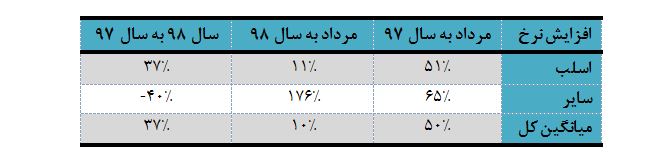 با توجه به اطلاعات بالا میتوان تغییرات نرخ فروش محصولات را طی 5 ماهه و همچنین مرداد ماه نسبت به میانگین نرخ فروش محصولات طی سال 97 به صورت زیر محاسبه نمود: