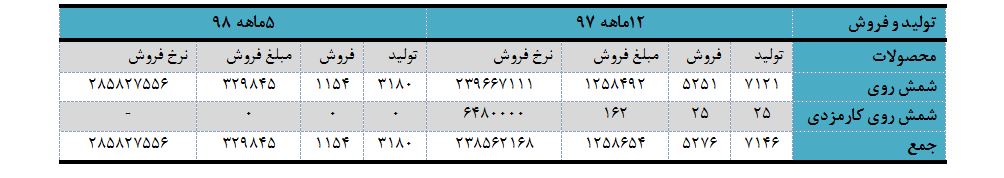 همچنین طی سال جاری با کاهش نرخ دلار در بازار ارز، نرخ محصولات شرکت نیز با کاهش مواجه شده چنانکه میانگین نرخ فروش محصولات طی 2 ماهه اول سال 298335802 ریال بوده که طی سه ماهه بعد با کاهش 4 درصدی مواجه شده است. همچنین قابل ذکر است که طی سال جاری میانگین تولید ماهانه شرکت با رشد 7 درصدی نسبت به میانگین ماهانه سال قبل همراه بوده ولی با توجه به نحوه فروش که قسمتی از آن به صورت صادراتی میباشد و مسائل مربوط به آن، با کاهش مقدار فروش در مقایسه با تولید، میانگین فروش ماهانه کاهش 48 درصدی را نشان میدهد. همچنین با توجه به رشد 20 درصدی در میانگین نرخ فروش سال جاری نسبت به سال 97 و کاهش 48 درصدی در مقدار فروش، میانگین درآمد ماهانه کاهش 37 درصدی را تجربه نموده است.