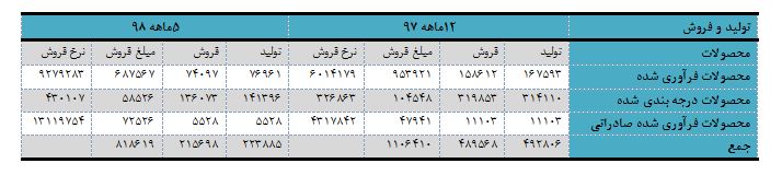 بر اساس جدول فوق می توان دید که طی سال جاری میزان فروش شرکت کاهش یافته است چنانکه طی سال 97 در حدود 99 درصد از تولید شرکت و طی سال جاری تنها 96 درصد از تولیدات به فروش رسیده است. همچنین بر اساس اطلاعات فوق میانگین تولید ماهانه شرکت نسبت به سال قبل 9 درصد افزایش یافته ولی میانگین مقدار فروش ماهانه تنها افزایش 6 درصدی را نشان میدهد. همچنین طی سال جاری با افزایش 68 درصدی در میانگین نرخ فروش محصولات و افزایش مقدار فروش، میانگین درآمد ماهانه نسبت به سال قبل افزایش 78 درصدی را تجربه نموده است.