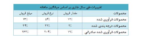 همچنینی با افزایش نرخ ارز طی سال 97 و در نتیجه افزایش نرخ فروش برای محصولات صادراتی، طی سال جاری میزان فروش صادراتی نسبت به داخلی با رشد بیشتری همراه بوده چنانکه فروش داخلی محصولات فرآوری شده 12 درصد و میزان فروش صادراتی 19 درصد رشد داشته است که با افزایش بیشتر در نرخ فروش، درآمد حاصل از صادرات را 263 درصد بر اساس میانگین ماهانه رشد داده است.