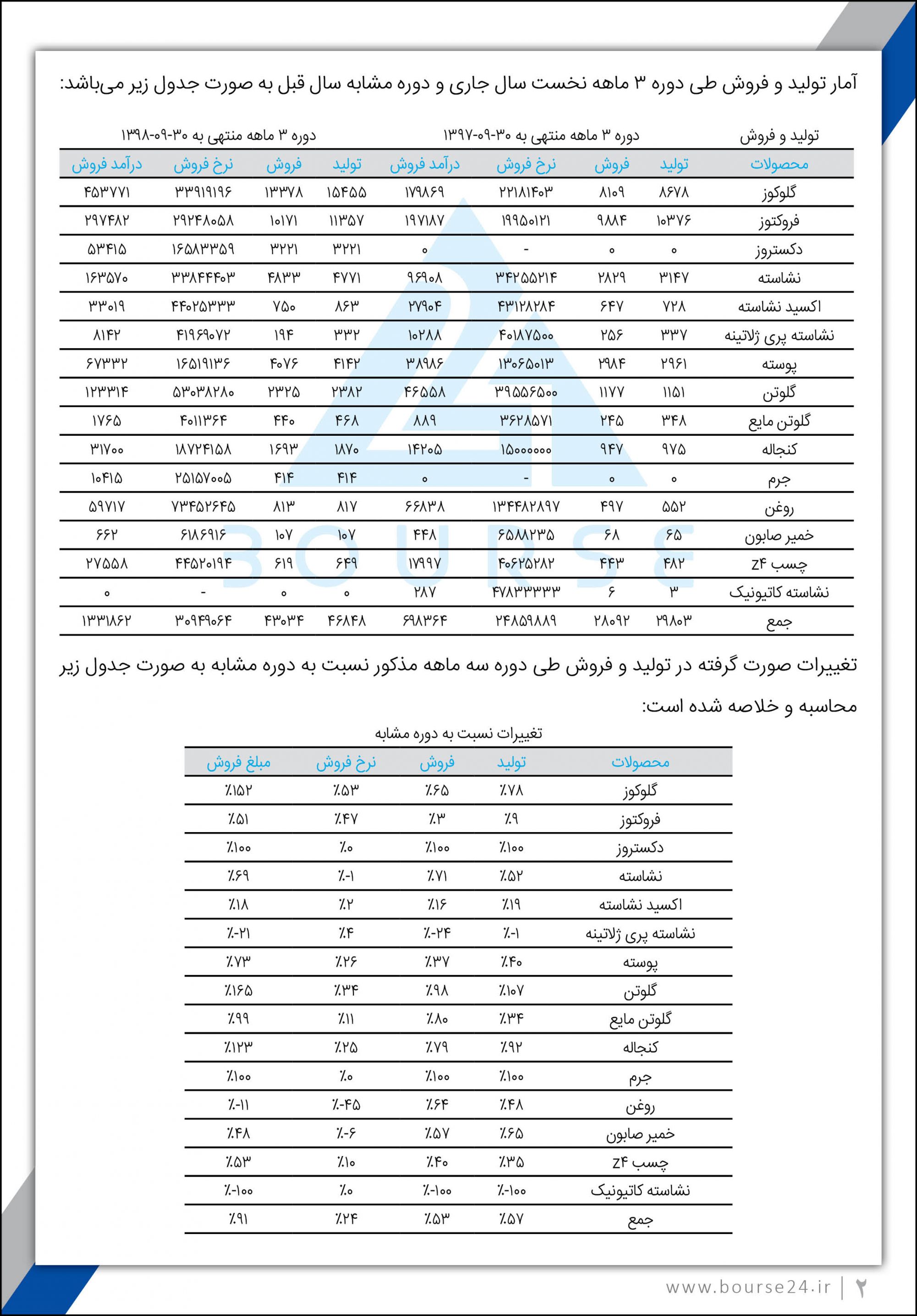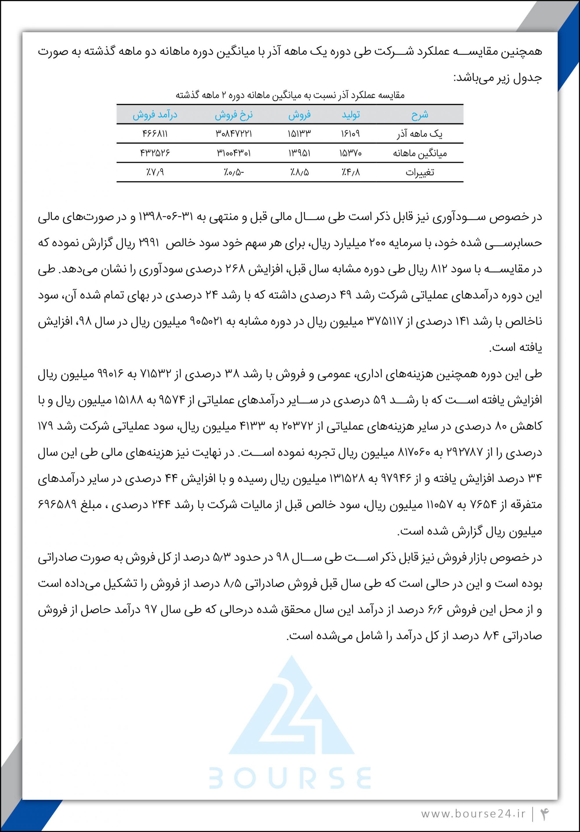 بر اساس گزارش فعالیت ماهانه آذر، تولیدات شرکت طی دوره ٣ ماهه نخست سال جاری ۴۶٨۴٨ تن محصول بوده است که نسبت به دوره مشابه سال قبل افزایش ۵٧ درصدی تولید را نشان میدهد. طی این دوره همچنین مقدار فروش با رشد .......