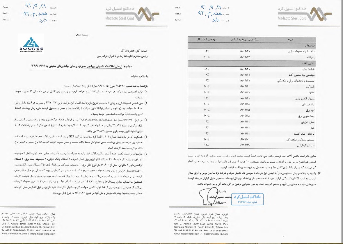 ه گزارش کدال نگر بورس ٢۴، شرکت ماداکتو استیل کرد در خصوص زمان بهره برداری کامل شرکت و صورت های مالی توضیحاتی ارائه نمود.