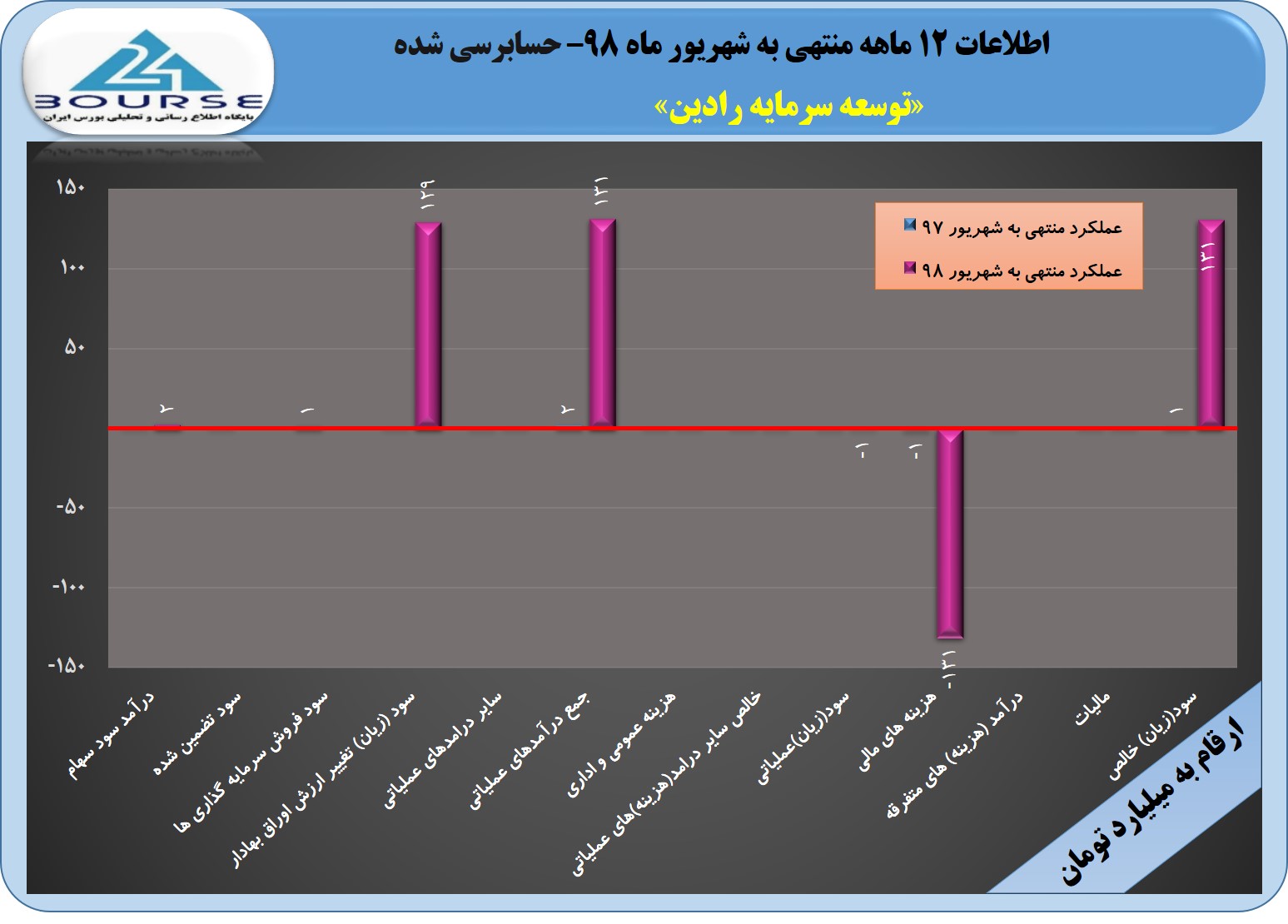 به گزارش کدال نگر بورس ٢۴ شرکت توسعه سرمایه رادین اززیرمجموعه های گروه صنعتی رنا در ١٢ ماهه منتهی به شهریور ١٣٠٩ میلیارد ریال سود خالص محقق نمود. این شرکت در مدت مشابه سال قبل تنها ١١ میلیارد ریال سود خالص کسب کرده بود. علت اصلی جهش سنگین سود در سال ٩٨ نسبت به سال قبل را می توان ناشی از شناسایی ١٢٨٩ میلیارد ریال سود تغییر ارزش سرمایه گذاری ها و رشد سایر درآمدهای عملیاتی دانست.