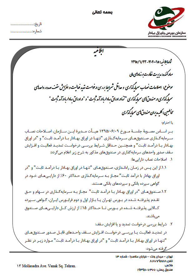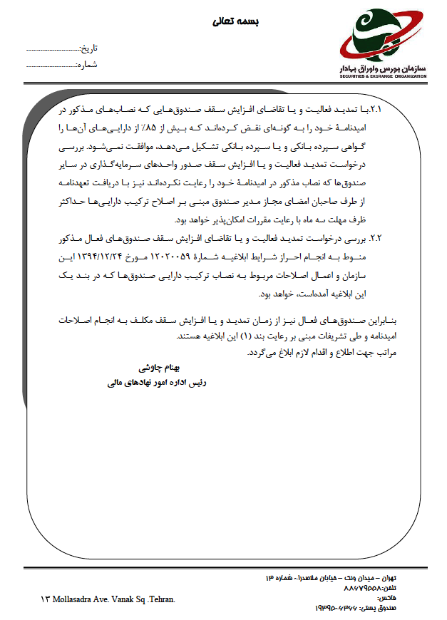 بررسی درخواست تمدید فعالیت و یا تقاضای افزایش سقف صندوق های فعال مذکور ، منوط به انجام احراز شرایط ابلاغیه شماره 12020059 مورخ 94.12.24 این سازمان و اعمال اصلاحات مربوط به نصاب ترکیب دارایی صندوق ها که در بند یک این ابلاغیه آمده است خواهد بود.