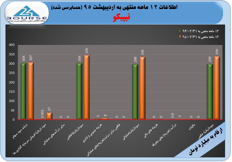 تیپیکو در گزارش حسابرسی شده سال مالی منتهی به اردیبشهت ٩۵، به ازاء هر سهم ١١٧٢ ریال سود ساخت.