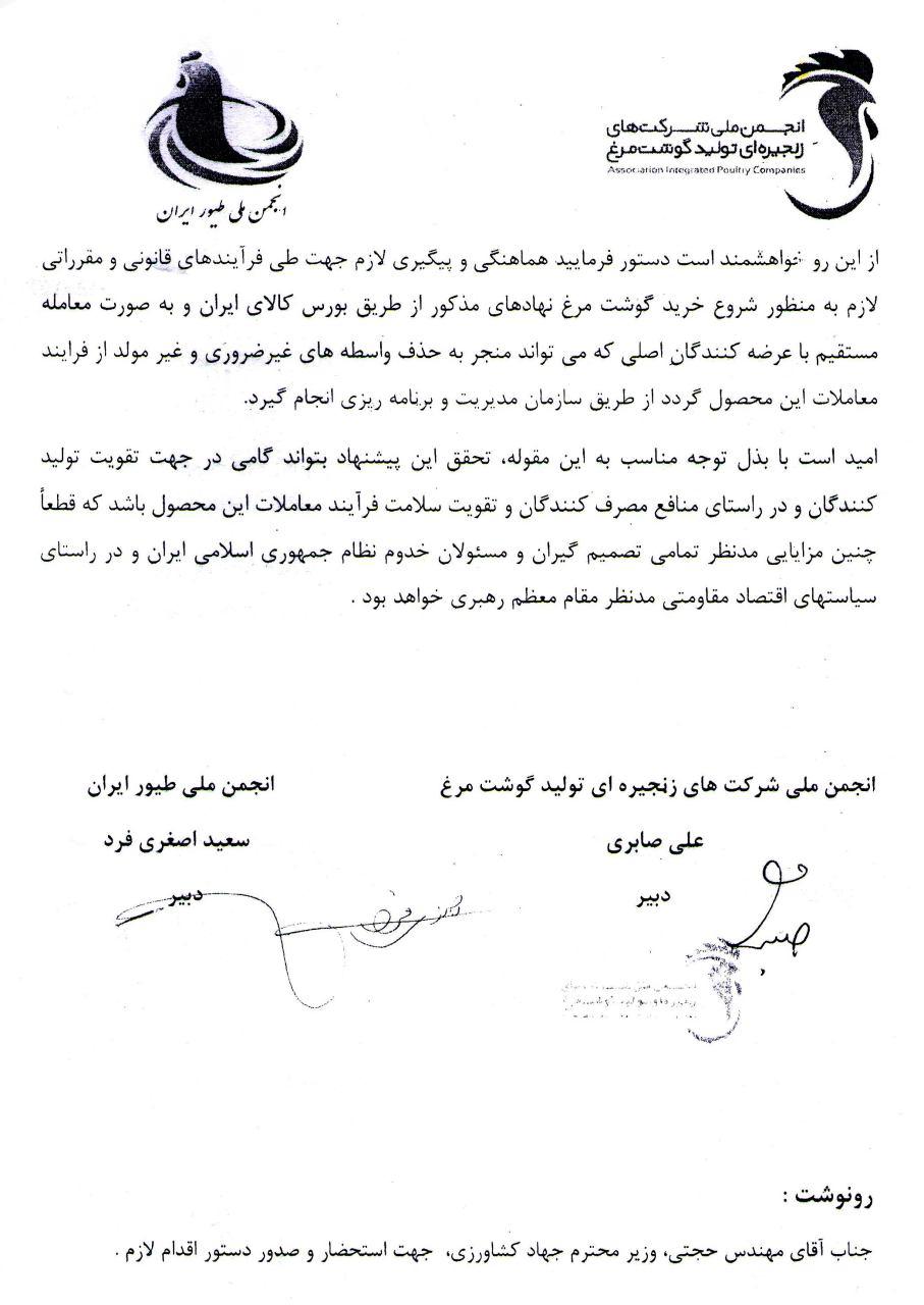 نامه ای مبنی بر در خواست انجمن ملی شرکت های زنجیره ای تولید گوشت مرغ و انجمن ملی طیور ایران برای عرضه مرغ در بورس کالا چندی پیش منتشر شد با این مضمون که عرضه مرغ (از جمله مرغ منجمد) در بورس کالای ایران در قالب قراردادهای نقدی و سلف عرضه صورت پذیرد، تا موجبات شکل گیری بازاری رقابتی با کشف نرخ منصفانه فراهم گردد.