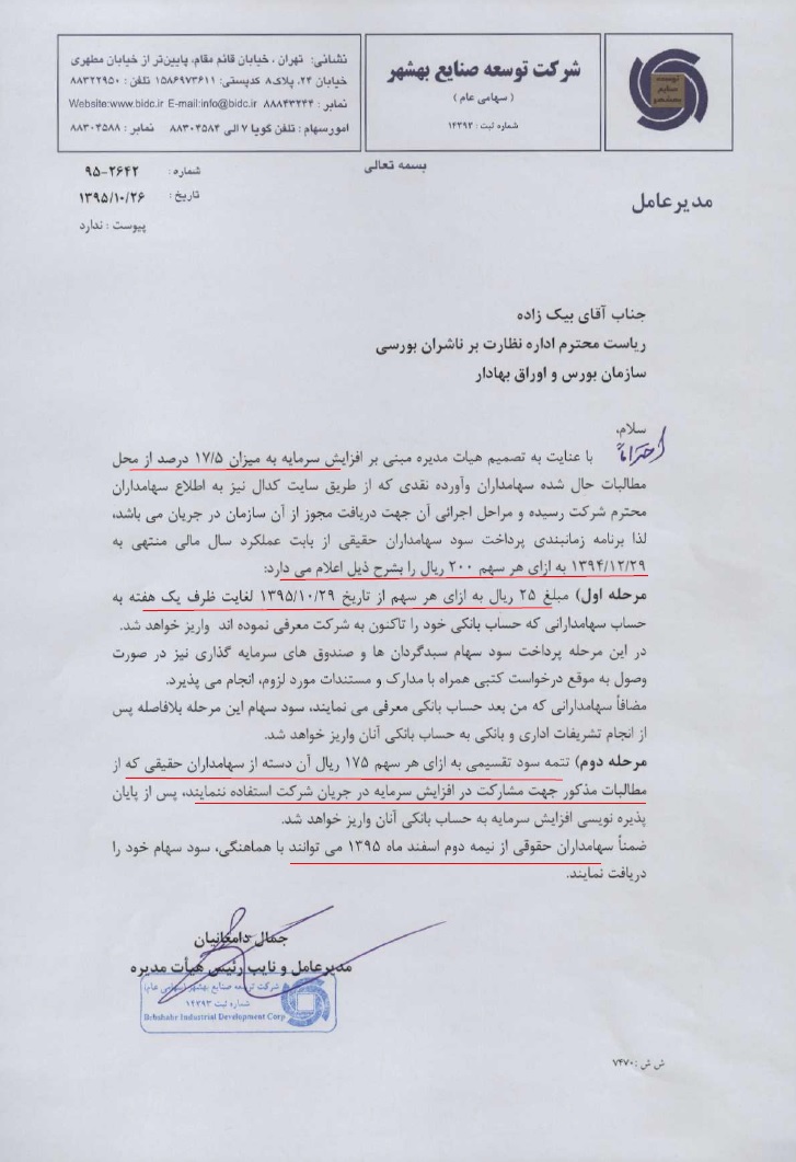 شرکت توسعه صنایع بهشهر از زمان پرداخت سود نقدی در دو مرحله خبر داد.
