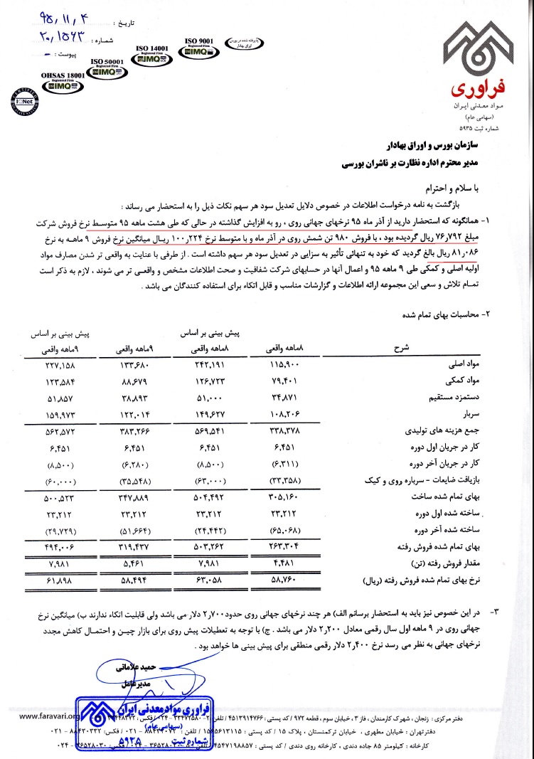 شرکت فرآوری مواد معدنی ایران از دلایل تعدیل بودجه بر اساس عملکرد ٩ ماهه خود گفت.