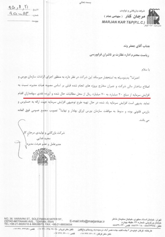 شرکت بازرگانی و تولیدی مرجان کار در صدد افزایش سرمایه ٢۵٠ درصدی از محل مطالبات جال شده و آورده نقدی سهامداران برآمده است .