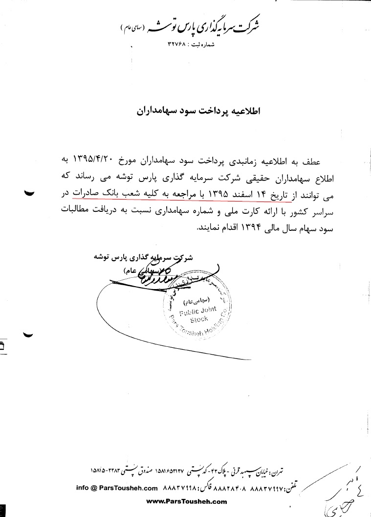 سرمایه گذاری پارس توشه زمان پرداخت سود نقدی خود را اعلام نمود.