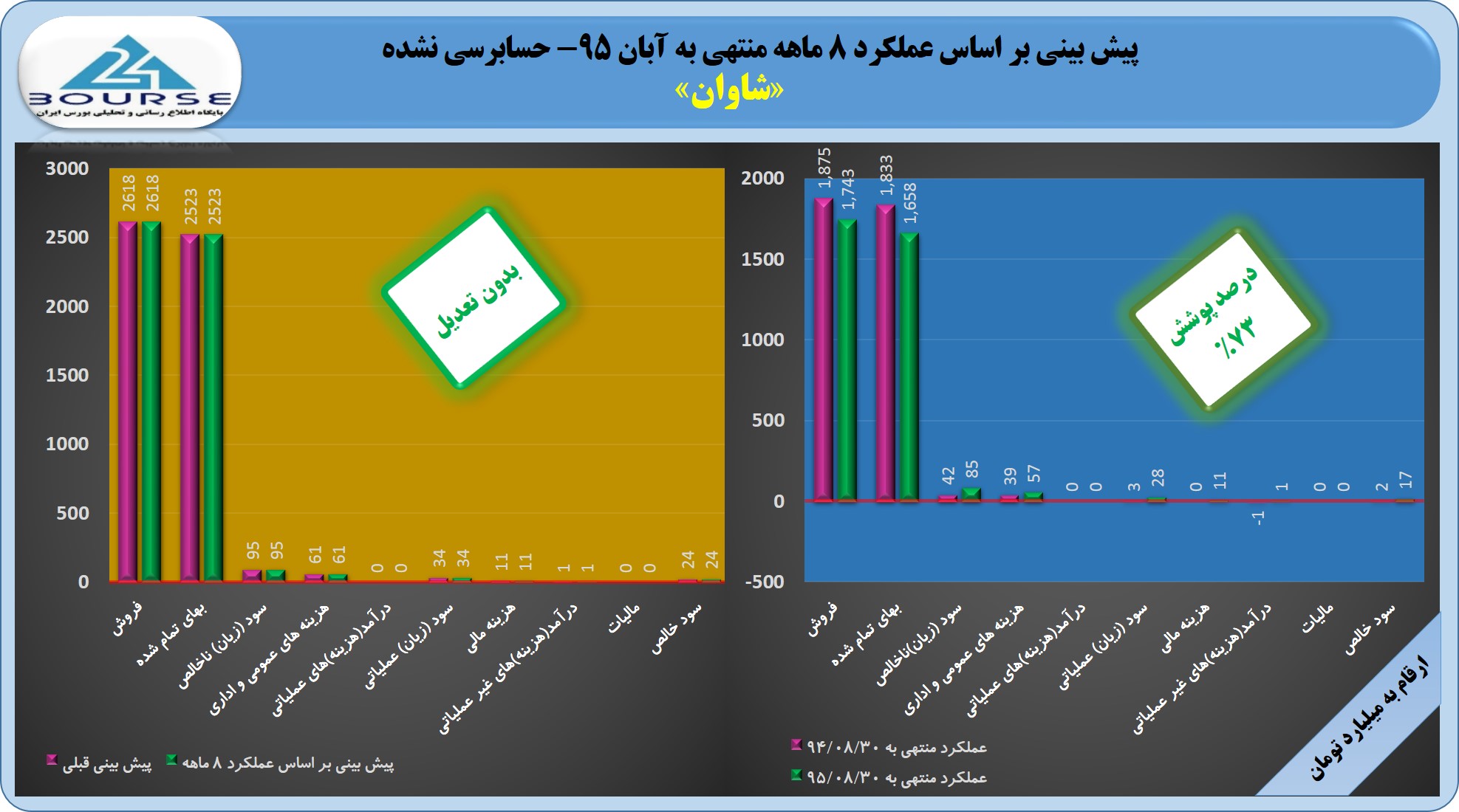 بورس24 : شرکت پالایش نفت لاوان (شاوان) در پیش بینی بر اساس عملکرد 8 ماهه منتهی به ابان ماه بدون تعدیل نسبت به پیش بینی قبل از آن برای هر سهم 207 ریال سود پیش بینی کرد. شاوان در مدت یاد شده برای هر سهم 152 سود محقق نمود که معادل 73 درصد سود بودجه شده می باشد. در مدت مشابه سال قبل 14 ریال سود برای هر سهم شناسایی شده بود.