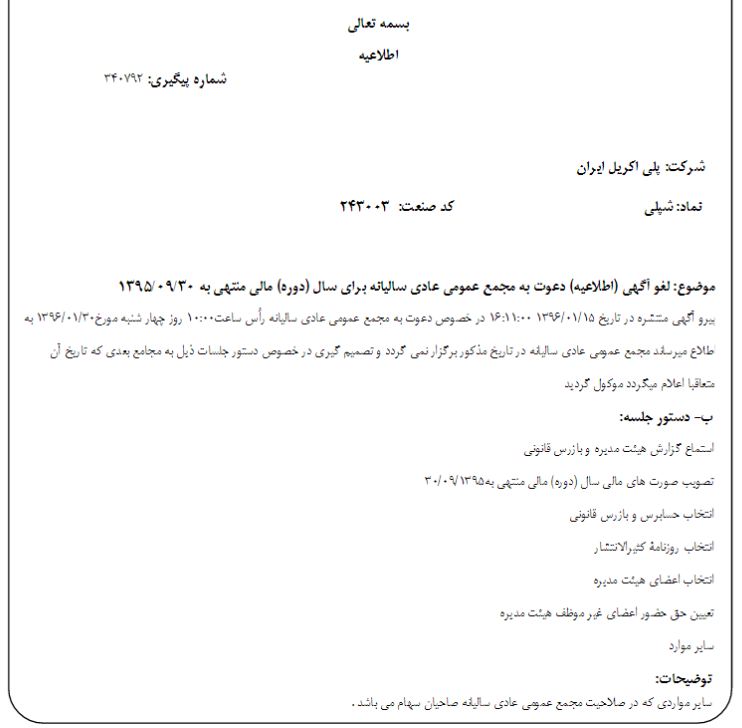به گزارش کدال نگر بورس٢۴، مجامع شرکت پلی اکریل در خصوص تصویب صورت های مالی و تصمیم گیری در خصوص خروج از شمولیت ماده ١۴١ قانون تجارت لغوو تاریخ مجدد ان متعاقبا اعلام خواهد شد.