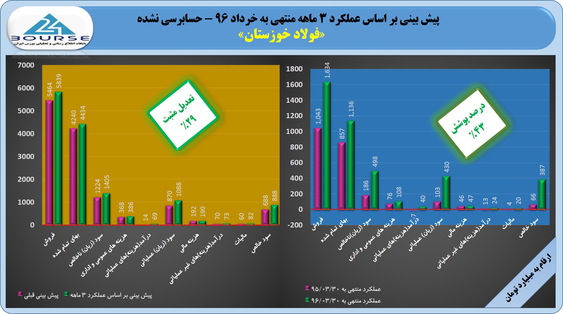 به گزارش کدال نگر بورس ٢۴ شرکت فولاد خوزستان (فخوز) در پیش بینی بر اساس عملکرد ٣ ماهه منتهی به خرداد ماه با ٢٩ درصد تعدیل مثبت نسبت به پیش بینی قبل از آن برای هر سهم ۶١۴ ریال سود پیش بینی کرد. علت اصلی این تعدیل مثبت افزایش ٣٧۴٣ میلیارد ریالی فروش و رشد ۵۴٩ میلیارد ریالی سایر هزینه های عملیاتی می باشد. گفتنی است در مدت ٣ ماهه فخوز برای هر سهم ٢۶٧ ریال سود شناسایی نمود که معادل ۴٣درصد سود پیش بینی شده می باشد.