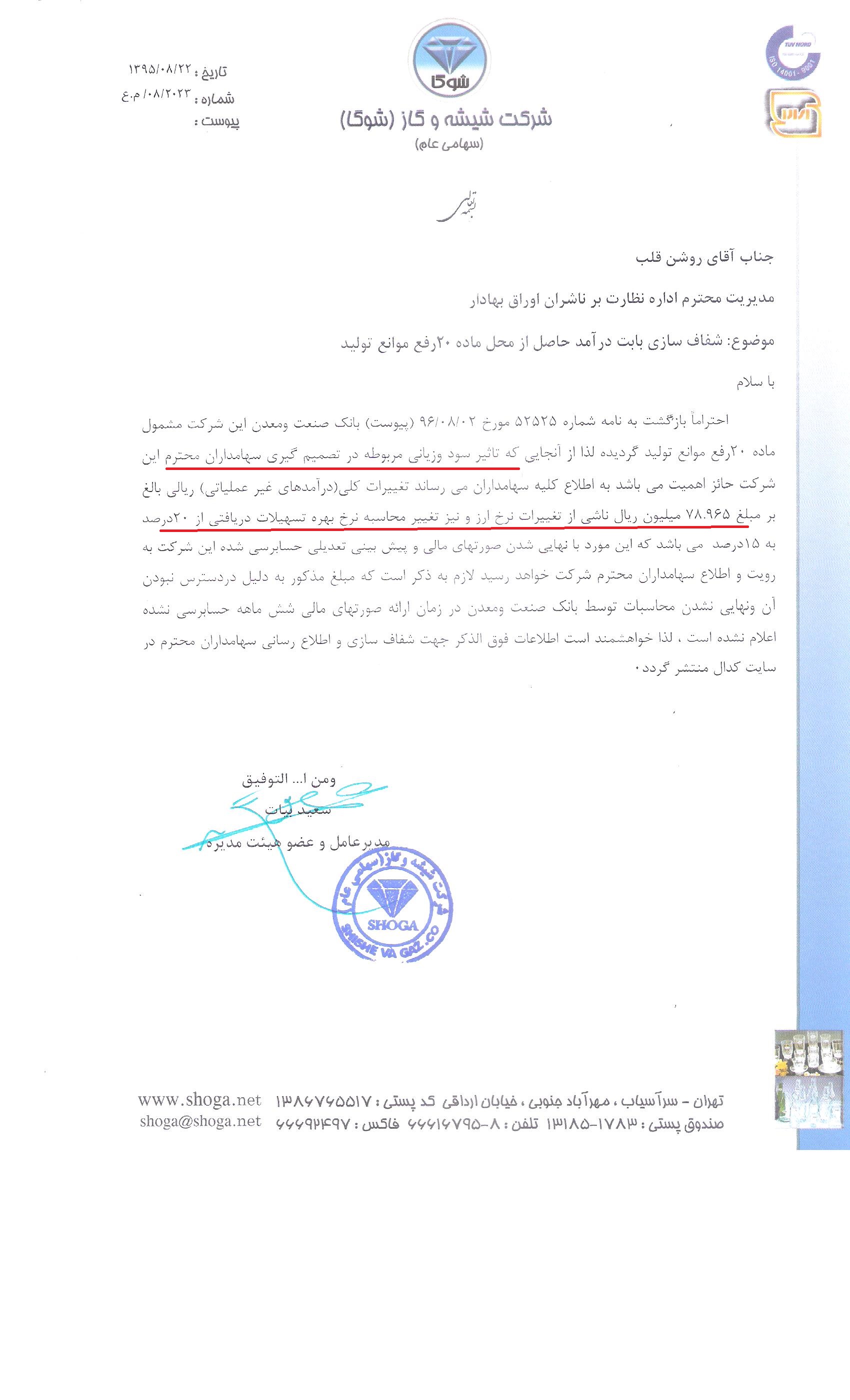 به گزارش کدال نگر بورس٢۴،شیشه و گاز هم در خصوص آخرین وضعیت خود اقدام به شفاف سازی نموده است.