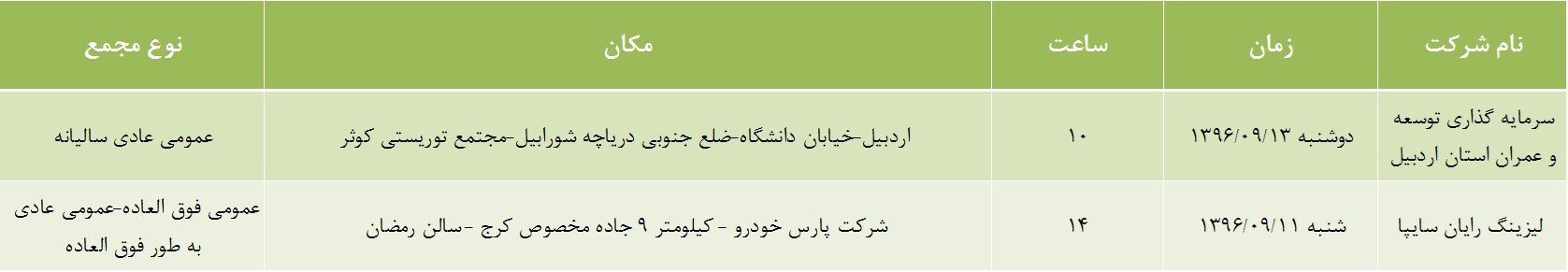 به گزارش کدال نگر بورس٢۴، دو شرکت رایان سایپا و توسعه و عمران اردبیل سهامداران خود را به مجامع فراخواندند.