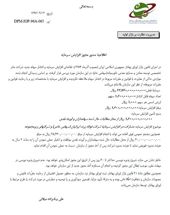 به گزارش کدال نگر بورس٢۴،میدکو مجوز افزایش سرمایه ١۶٠ میلیارد تومانی برای رساندن سرمایه خود به سطوح بالای ٢۵٠٠ میلیارد تومان را دریافت کرد. بدین ترتیب، این افزایش سرمایه از محل مطالبات و آورده نقدی سهامداران به منظور مشارکت در افزایش سرمایه فولاد زرند ایرانیان و شرکت های تابعه خواهد بود. همچنین مجمع می تواند اختیار افزایش سرمایه تا دو سال از سطوح ٢۵٣۶ میلیارد تا ٣٠٠٠ میلیارد تومان را به هیئت مدیره تفویض نماید.