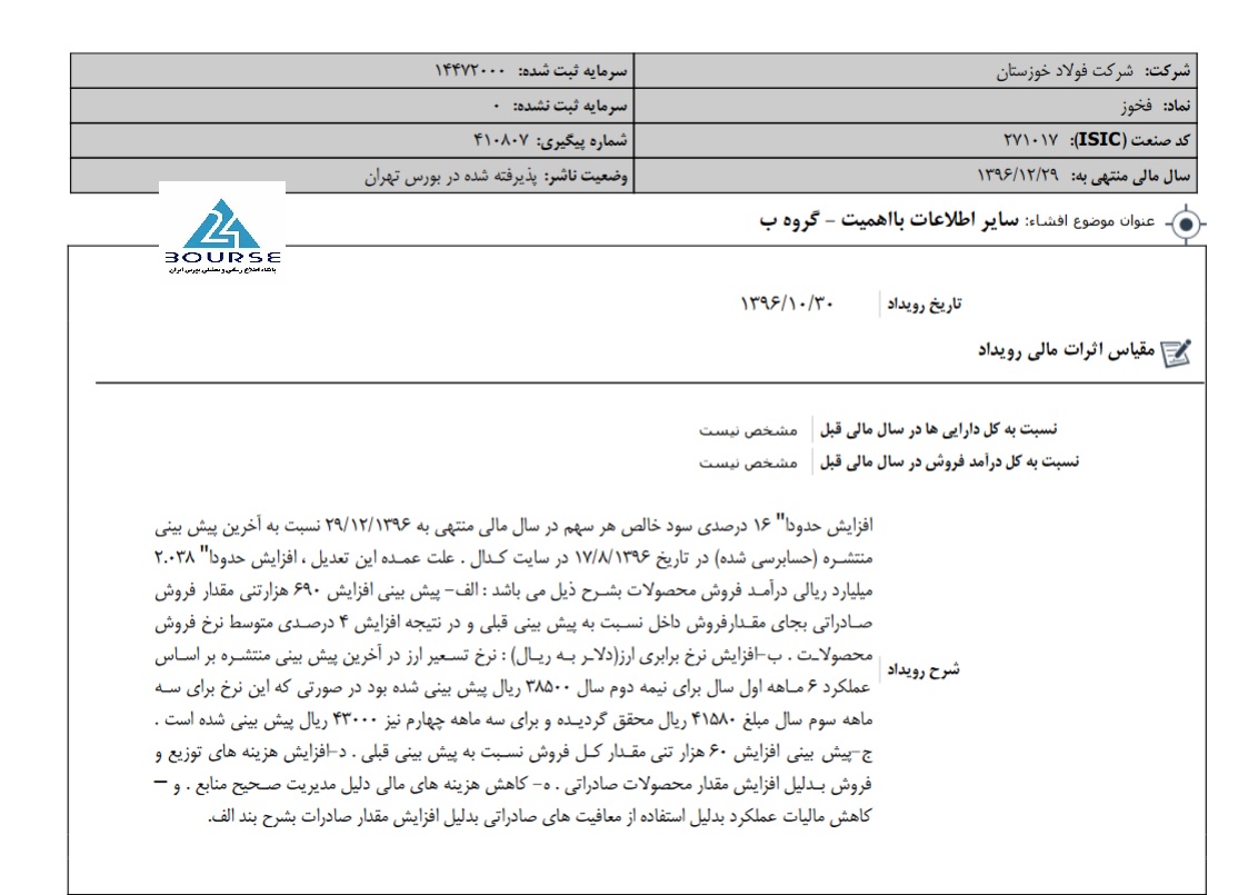به گزارش کدال نگر بورس ٢۴، شرکت اعلام داشت افزایش حدودا ١۶ درصدی سود خالص هر سهم در سال مالی منتهی به ٢٩/١٢/١٣٩۶ نسبت به آخرین پیش بینی منتشره (حسابرسی شده) در تاریخ ١٧/٨/١٣٩۶ در سایت کدال . علت عمده این تعدیل ، افزایش حدودا ٢.٠٣٨ میلیارد ریالی درآمد فروش محصولات بشرح ذیل می باشد : الف- پیش بینی افزایش ۶٩٠ هزارتنی مقدار فروش صادراتی بجای مقدارفروش داخل نسبت به پیش بینی قبلی و در نتیجه افزایش ۴ درصدی متوسط نرخ فروش محصولات . ب-افزایش نرخ برابری ارز(دلار به ریال) : نرخ تسعیر ارز در آخرین پیش بینی منتشره بر اساس عملکرد ۶ ماهه اول سال برای نیمه دوم سال ٣٨۵٠٠ ریال پیش بینی شده بود در صورتی که این نرخ برای سه ماهه سوم سال مبلغ ۴١۵٨٠ ریال محقق گردیده و برای سه ماهه چهارم نیز ۴٣٠٠٠ ریال پیش بینی شده است . ج-پیش بینی افزایش ۶٠ هزار تنی مقدار کل فروش نسبت به پیش بینی قبلی . د-افزایش هزینه های توزیع و فروش بدلیل افزایش مقدار محصولات صادراتی . ه- کاهش هزینه های مالی دلیل مدیریت صحیح منابع . و – کاهش مالیات عملکرد بدلیل استفاده از معافیت های صادراتی بدلیل افزایش مقدار صادرات بشرح بند الف.