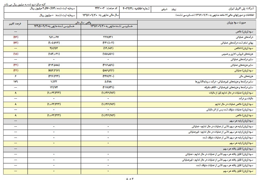 به گزارش کدال نگر بورس٢۴،پلی اکریل ایران سال مالی ٩۶ خود را با تحقق زیان ٣٢١ ریالی به ازای هر سهم به اتمام رساند. گفتنی است،این شرکت با رشد ٨ درصدی زیان خود در سال جاری به نسبت سال قبل همراه شده است.شرکتی که علی رغم کاهش زیان عملیاتی به دلیل شناسایی زیان متفرقه با رشد زیان همراه شده است.