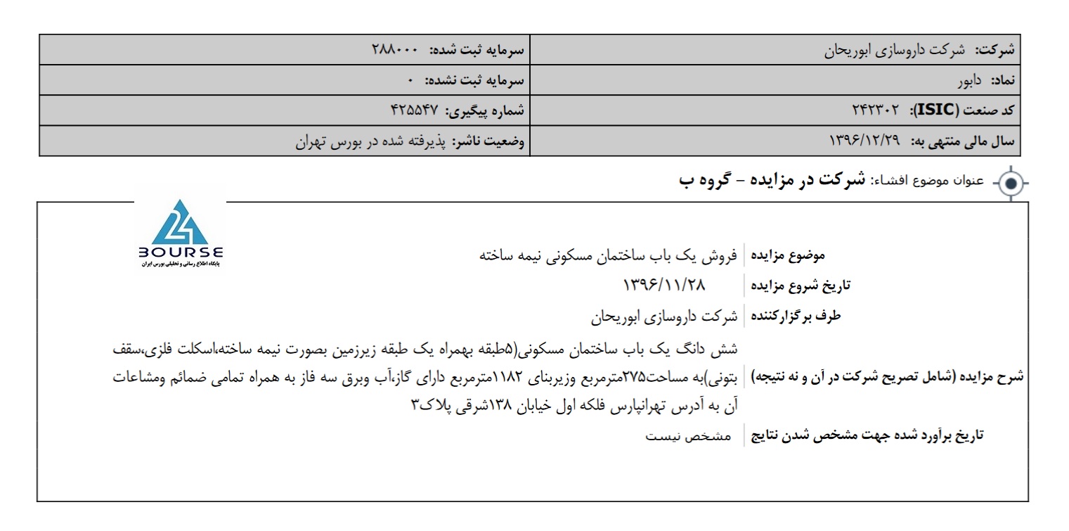 به گزارش کدال نگر بورس ٢۴، شرکت داروسازی ابوریحان از تصمیم خود برای فروش شش دانگ یک باب ساختمان مسکونی(۵طبقه بهمراه یک طبقه زیرزمین بصورت نیمه ساخته،اسکلت فلزی،سقف بتونی)به مساحت٢٧۵مترمربع وزیربنای ١١٨٢مترمربع دارای گاز،آب وبرق سه فاز به همراه تمامی ضمائم ومشاعات آن به آدرس تهرانپارس فلکه اول خیابان ١٣٨شرقی پلاک٣ خبر داد.