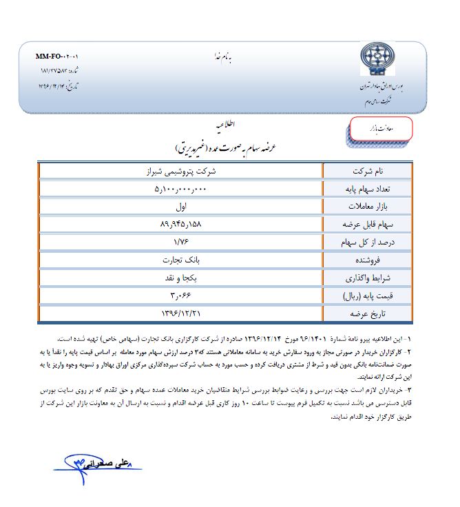 به گزارش بورس٢۴،بانک تجارت بلوک ٢.٧ درصدی سهام فولاد مبارکه با قیمت پایه هر سهم ٣٢۴ تومان و بلوک ١.٧ درصدی سهام پتروشیمی شیراز با قیمت پایه هر سهم ٣٠۶ تومان و بلوک حدود١.٢ درصدی سهام پتروشیمی پردیس را با قیمت پایه هر سهم ٨٨٢ تومان را همگی در تاریخ بیست و یکم اسفند ماه بر روی میز فروش می برد.