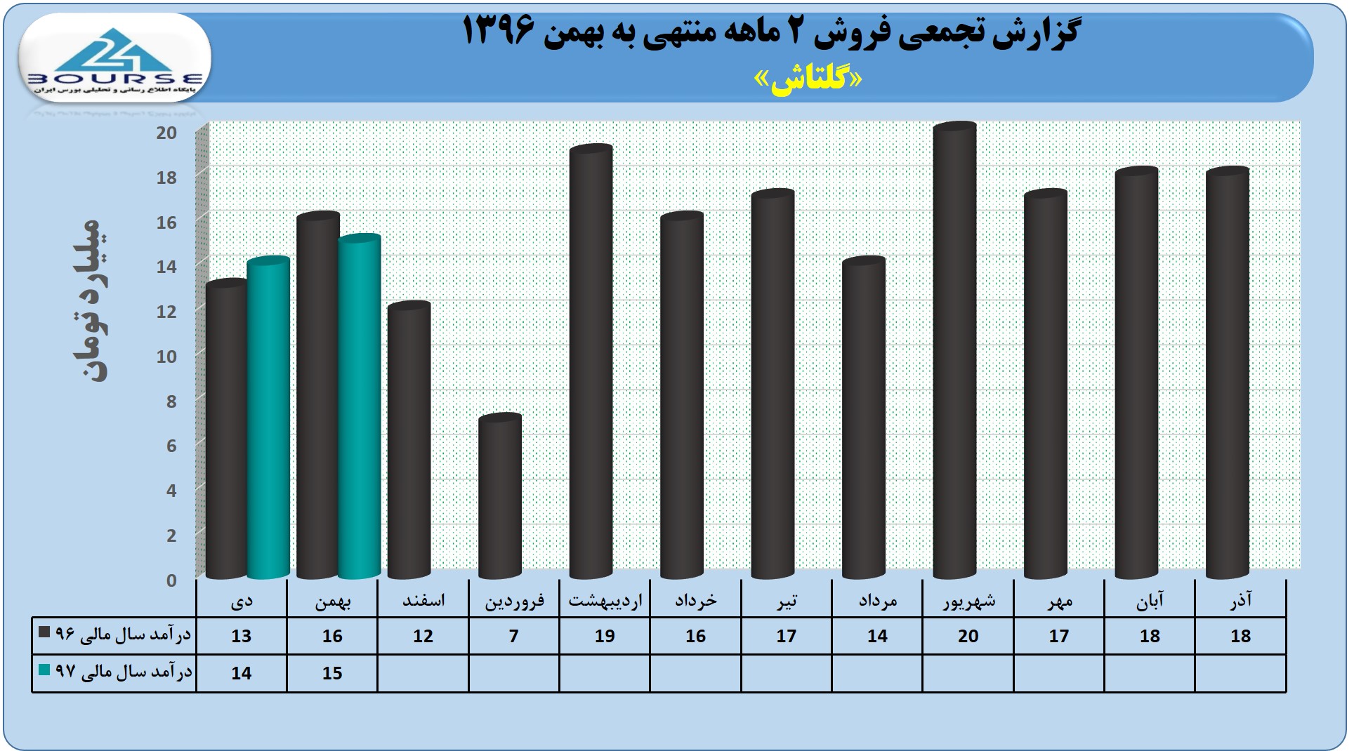 به گزارش کدال نگر بورس ٢۴، در شرکت گلتاش شاهد افزایش درآمد فروش در دو ماه نخست سال مالی ١٣٩٧ نسبت به مدت مشابه در سال ١٣٩۶ بودیم. مجموع درآمد این شرکت در دو ماهه نخست سال مالی جاری به ٢٨ میلیارد تومان رسید.