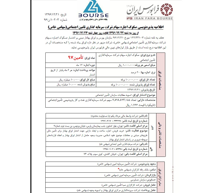 به گزارش بورس٢۴، هزار میلیارد تومان اوراق صکوک تامین اجتماعی از فردا با نرخ سود ٢٠ درصد در بازار فرابورس پذیره نویسی می شود.