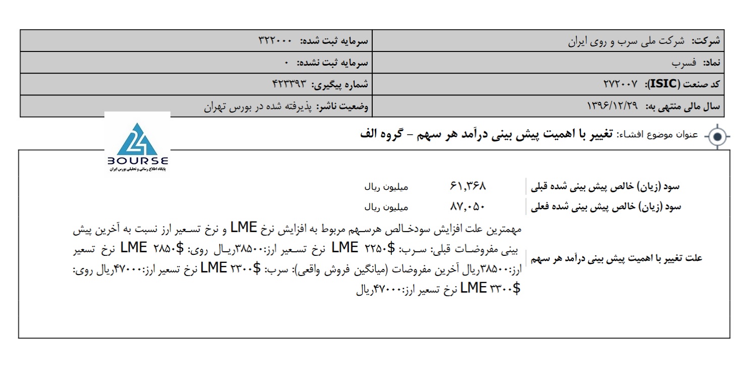 به گزارش کدال نگر بورس ٢۴، شرکت در خصوص افزایش سود هر سهم از ١٩١ به ٢٧٠ ریال توضیح داد: مهمترین علت افزایش سودخالص هرسهم مربوط به افزایش نرخ LME و نرخ تسعیر ارز نسبت به آخرین پیش بینی مفروضات قبلی: سرب: LME ٢٢۵٠$ نرخ تسعیر ارز:٣٨۵٠٠ریال روی: LME ٢٨۵٠$ نرخ تسعیر ارز:٣٨۵٠٠ریال آخرین مفروضات (میانگین فروش واقعی): سرب: LME ٢٣٠٠$ نرخ تسعیر ارز:۴٧٠٠٠ریال روی: LME ٣٣٠٠$ نرخ تسعیر ارز:۴٧٠٠٠ریال