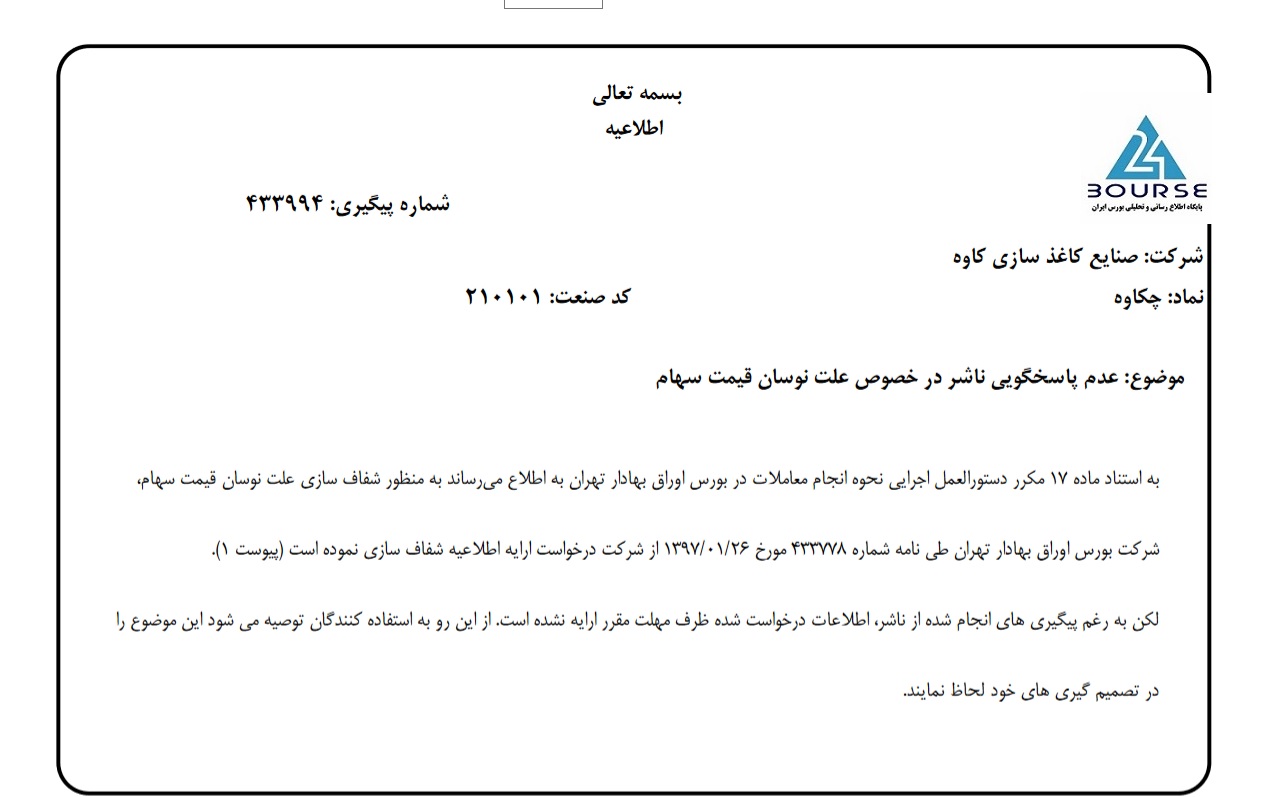 به گزارش کدال نگر بورس ٢۴، شرکت بورس اوراق بهادار اعلام داشت به منظور شفاف سازی علت نوسان قیمت سهام، از شرکت صنایع کاغذ سازی کاوه درخواست ارایه اطلاعیه شفاف سازی نموده است. لکن به رغم پیگیری های انجام شده اطلاعات درخواست شده ظرف مهلت مقرر ارایه نشده است. از این رو به استفاده کنندگان توصیه می شود این موضوع را در تصمیم گیری های خود لحاظ نمایند.