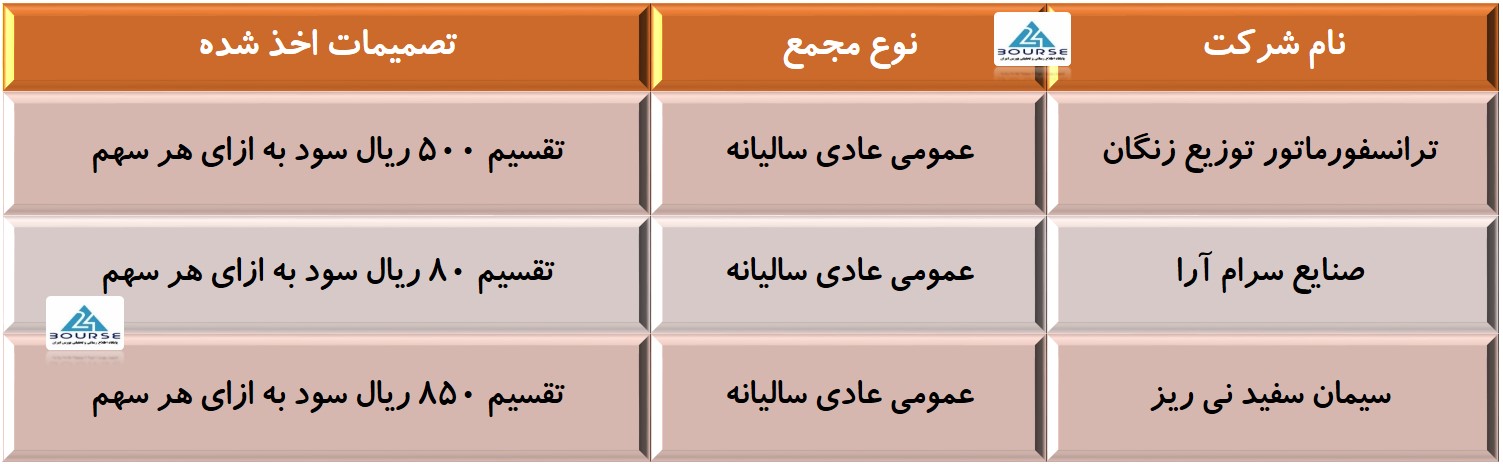 به گزارش کدال نگر بورس٢۴، سه شرکت دیگر از آخرین تصمیمات خود در مجامع گغتند.