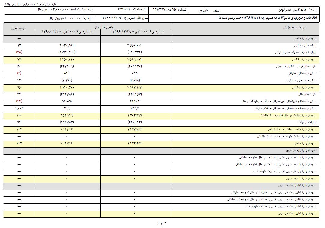 به گزارش کدال نگر بورس٢۴، سرانجام های وب با تعدیل منفی صورت های مالی ١٢ ماهه سال ٩۶ را منتشر و در نهایت به سود ٣۶٨ ریالی رضایت داد گفتنی است،این سود با کاهش ١۴ درصد به نسبت آخرین پیشبینی همراه اما به نسبت سال ٩۵ با رشد ١١٣ درصدی همراه شده است