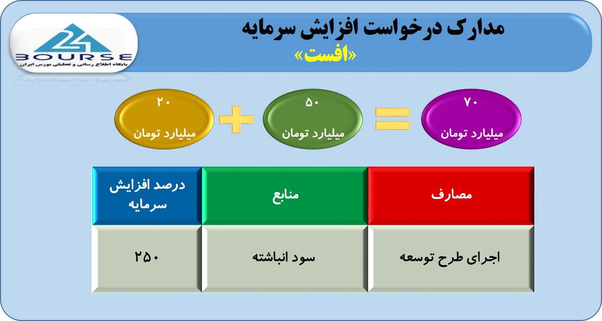 به گزارش کدال نگر بورس ٢۴، سازمان بورس و اوراق یهادار تهران اعلام داشت افزایش سرمایه شرکت افست با رعایت قوانین و مقرّرات مربوطه، از نظر این سازمان بلامانع میباشد. همچنین مجمع عمومی فوقالعاده میتواند با انجام مرحله دوم افزایش سرمایه از مبلغ ٧٠٠,٠٠٠,٠٠٠,٠٠٠ ریال بهمبلغ ٩٩٠,٠٠٠,٠٠٠,٠٠٠ ریال از محل سود انباشته (مبلغ ٢٩۴ر٢۶٨ر٩٧٠ر٢۶٩ ریال) و سایر اندوختهها (مبلغ ٧٠۶ر٧٣١ر٠٢٩ر٢٠ ریال) موافقت و اختیار عملی نمودن آن را بهمدت ٢ سال به هیئتمدیره تفویض نماید، تا هیئتمدیرة شرکت در صورت تحقق اهداف پیشبینی شده در مرحله اول افزایش سرمایه پس از اخذ مجوز از سازمان نسبت به عملی نمودن آن اقدام نماید.