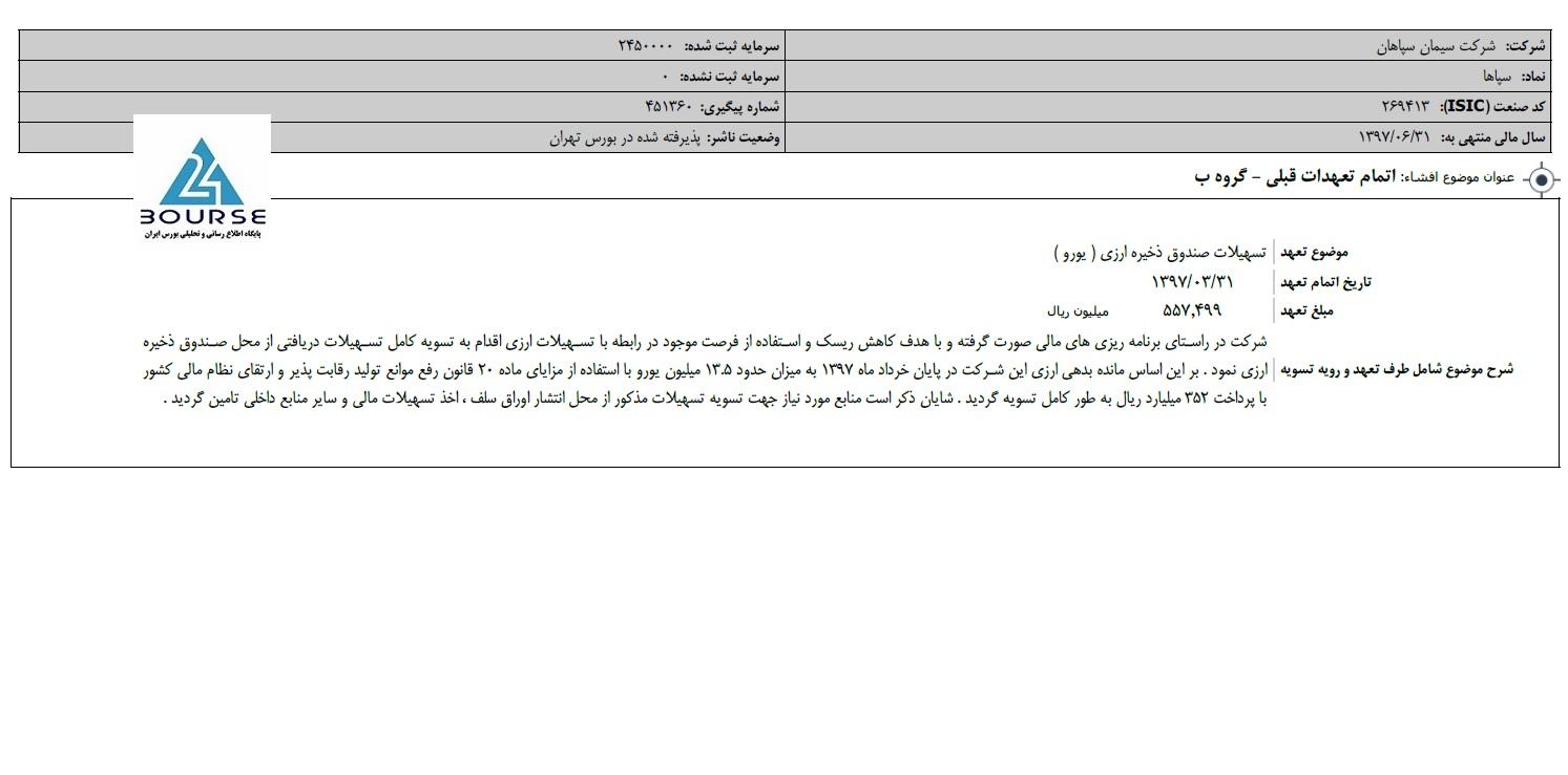 به گزارش کدال نگر بورس ٢۴، شرکت سیمان سپاهان اعلام داشت در راستای برنامه ریزی های مالی صورت گرفته و با هدف کاهش ریسک و استفاده از فرصت موجود در رابطه با تسهیلات ارزی اقدام به تسویه کامل تسهیلات دریافتی از محل صندوق ذخیره ارزی نمود . بر این اساس مانده بدهی ارزی این شرکت در پایان خرداد ماه ١٣٩٧ به میزان حدود ١٣.۵ میلیون یورو با استفاده از مزایای ماده ٢٠ قانون رفع موانع تولید رقابت پذیر و ارتقای نظام مالی کشور با پرداخت ٣۵٢ میلیارد ریال به طور کامل تسویه گردید . شایان ذکر است منابع مورد نیاز جهت تسویه تسهیلات مذکور از محل انتشار اوراق سلف ، اخذ تسهیلات مالی و سایر منابع داخلی تامین گردید .