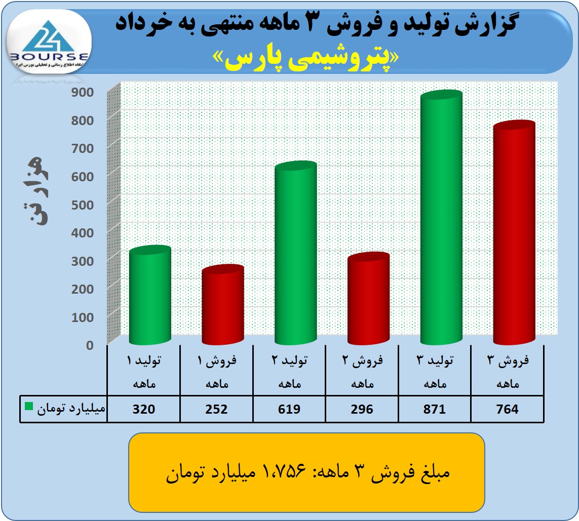 به گزارش کدال نگر بورس ٢۴ شرکت پتروشیمی پارس در فروردین، اردیبهشت و خرداد ماه سال ١٣٩٧، به ترتیب ۴۶۶، ٧٣٣ و ۵۵٧ میلیارد تومان درآمد از فروش محصولات خود کسب نمود. رشد نرخ فروش بیشتر محصولات این شرکت در خرداد ماه در مقایسه با میانگین ٣ ماهه، نکته مثبت گزارش این شرکت می باشد.