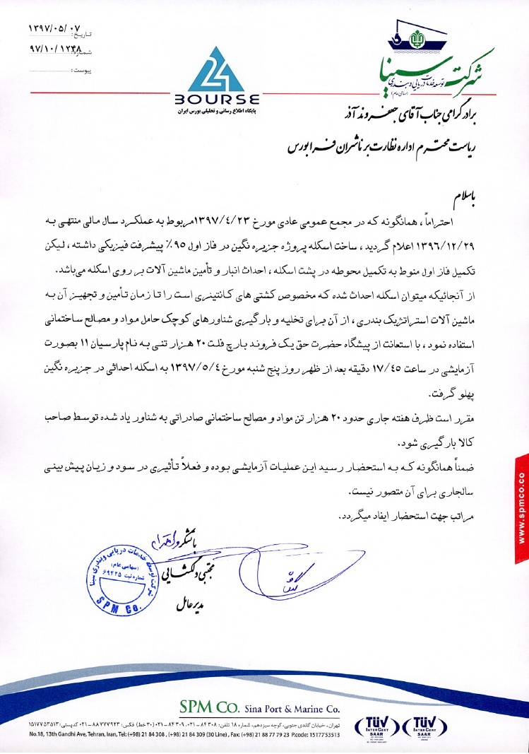 به گزارش کدال نگر بورس ٢۴، شرکت توسعه خدمات دریایی و بندری سینا در خصوص ساخت اسکله پروژه جزیره نگین توضیحاتی ارائه نمود.