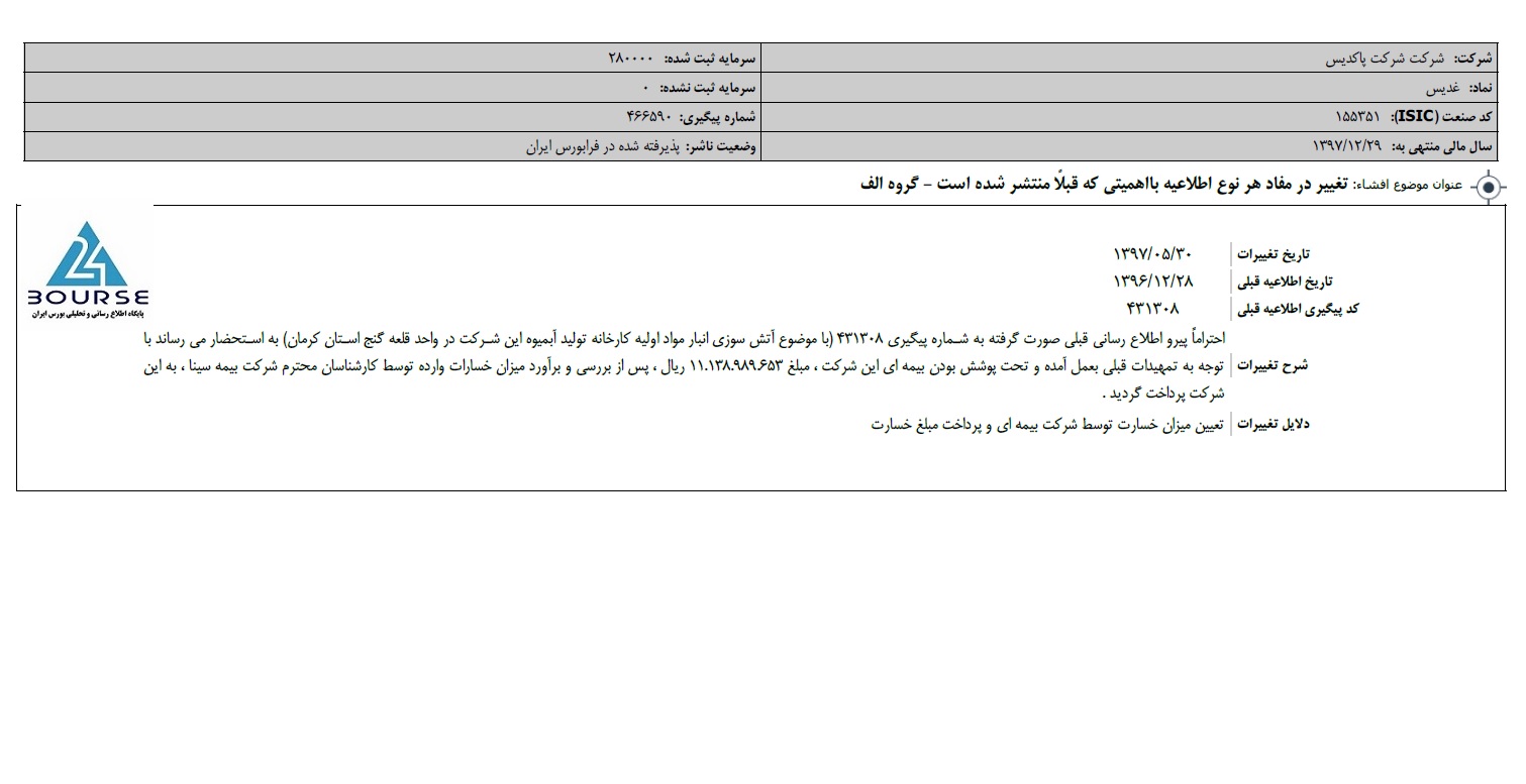 به گزارش کدال نگر بورس ٢۴، شرکت پاکدیس اعلام داشت پیرو اطلاع رسانی قبلی صورت گرفته به شماره پیگیری ۴٣١٣٠٨ (با موضوع آتش سوزی انبار مواد اولیه کارخانه تولید آبمیوه این شرکت در واحد قلعه گنج استان کرمان) به استحضار می رساند با توجه به تمهیدات قبلی بعمل آمده و تحت پوشش بودن بیمه ای این شرکت ، مبلغ ١١.١٣٨.٩٨٩.۶۵٣ ریال ، پس از بررسی و برآورد میزان خسارات وارده توسط کارشناسان محترم شرکت بیمه سینا ، به این شرکت پرداخت گردید .