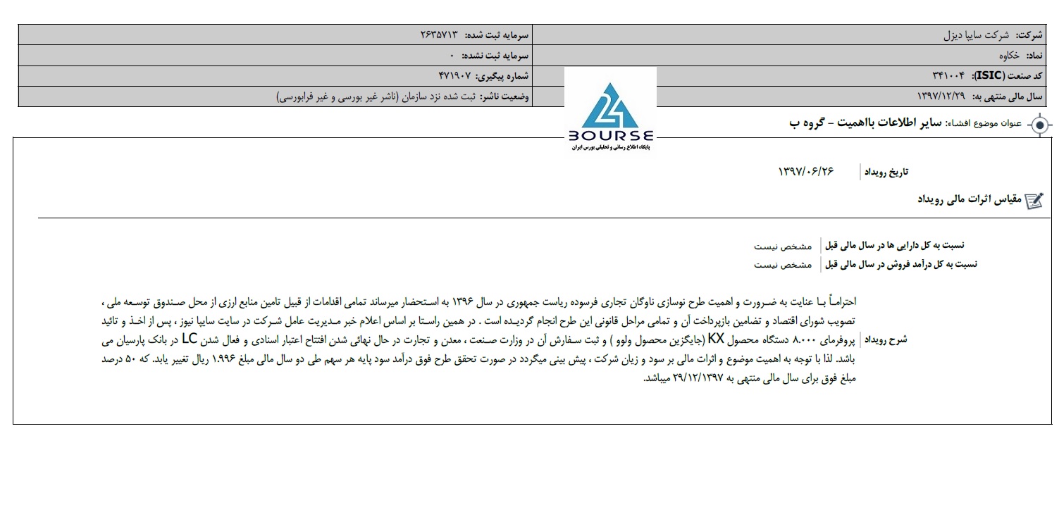 به گزارش کدال نگر بورس ٢۴، شرکت سایپا دیزل اعلام داشت با عنایت به ضرورت و اهمیت طرح نوسازی ناوگان تجاری فرسوده ریاست جمهوری در سال ١٣٩۶ به استحضار میرساند تمامی اقدامات از قبیل تامین منابع ارزی از محل صندوق توسعه ملی ، تصویب شورای اقتصاد و تضامین بازپرداخت آن و تمامی مراحل قانونی این طرح انجام گردیده است . در همین راستا بر اساس اعلام خبر مدیریت عامل شرکت در سایت سایپا نیوز ، پس از اخذ و تائید پروفرمای ٨.٠٠٠ دستگاه محصول KX (جایگزین محصول ولوو ) و ثبت سفارش آن در وزارت صنعت ، معدن و تجارت در حال نهائی شدن افتتاح اعتبار اسنادی و فعال شدن LC در بانک پارسیان می باشد. لذا با توجه به اهمیت موضوع و اثرات مالی بر سود و زیان شرکت ، پیش بینی میگردد در صورت تحقق طرح فوق درآمد سود پایه هر سهم طی دو سال مالی مبلغ ١.٩٩۶ ریال تغییر یابد. که ۵٠ درصد مبلغ فوق برای سال مالی منتهی به پایان اسفند ٩٧میباشد.