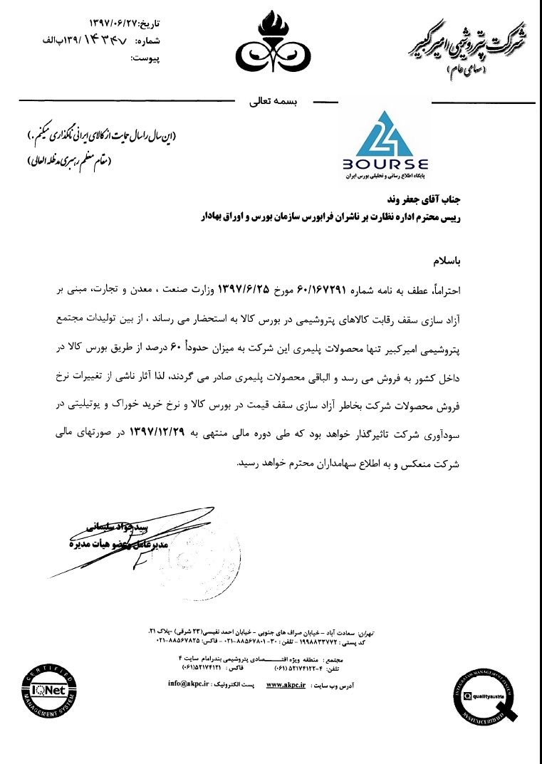 به گزارش کدال نگر بورس ٢۴، شرکت پتروشیمی امیر کبیر اعلام داشت عطف به نامه شماره ۶٠/١۶٧٢٩١ مورخ ١٣٩٧/٠۶/٢۵ وزارت صنعت ، معدن و تجارت ، مبنی بر آزاد سازی سقف رقابت کالاهای پتروشیمی در بورس کالا به استحضار می رساند ، از بین تولیدات مجتمع پتروشیمی امیر کبیر تنها محصولات پلیمری این شرکت به میزان حدوداً ۶٠ درصد از طریق بورس کالا در داخل کشور به فروش می رسد و الباقی محصولات پلیمری صادر میگردند ، لذا آثار ناشی از تغییرات نرخ فروش محصولات شرکت بخاطر آزاد سازی سقف قیمت در بورس کالا و نرخ خرید خوراک و یوتیلیتی در سود آوری شرکت تاثیرگذار خواهد بود که طی دوره مالی منتهی به ١٣٩٧/١٢/٢٩در صورتهای مالی شرکت منعکس و به اطلاع سهامداران محترم خواهد رسید.