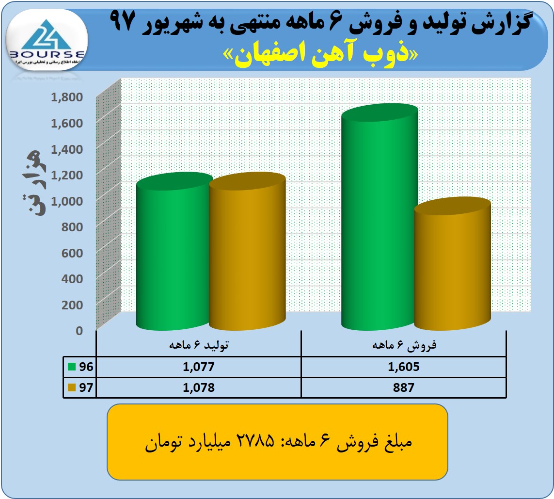 به گزارش کدال نگر بورس ٢۴ شرکت ذوب آهن اصفهان در ۶ ماهه منتهی به شهریور ١٣٩٧ از فروش محصولات خود ٢٧٨۵ میلیارد تومان درآمد کسب نمود. هم چنین در شهریور ماه مبلغ فروش این شرکت به ۶٠٧ میلیارد تومان رسید که نسبت به مرداد ماه ٣٧ میلیارد تومان رشد داشته است. گفتنی است مبلغ فروش ذوب در مدت ۶ ماهه سال ٩٧ در مقایسه با مدت مشابه سال قبل ۵١ درصد رشد داشته است. رشد نرخ فروش محصولات این شرکت در شهریور نسبت به میانگین ۶ ماهه نیز نکته مثبت دیگر گزارش ذوب می باشد.
